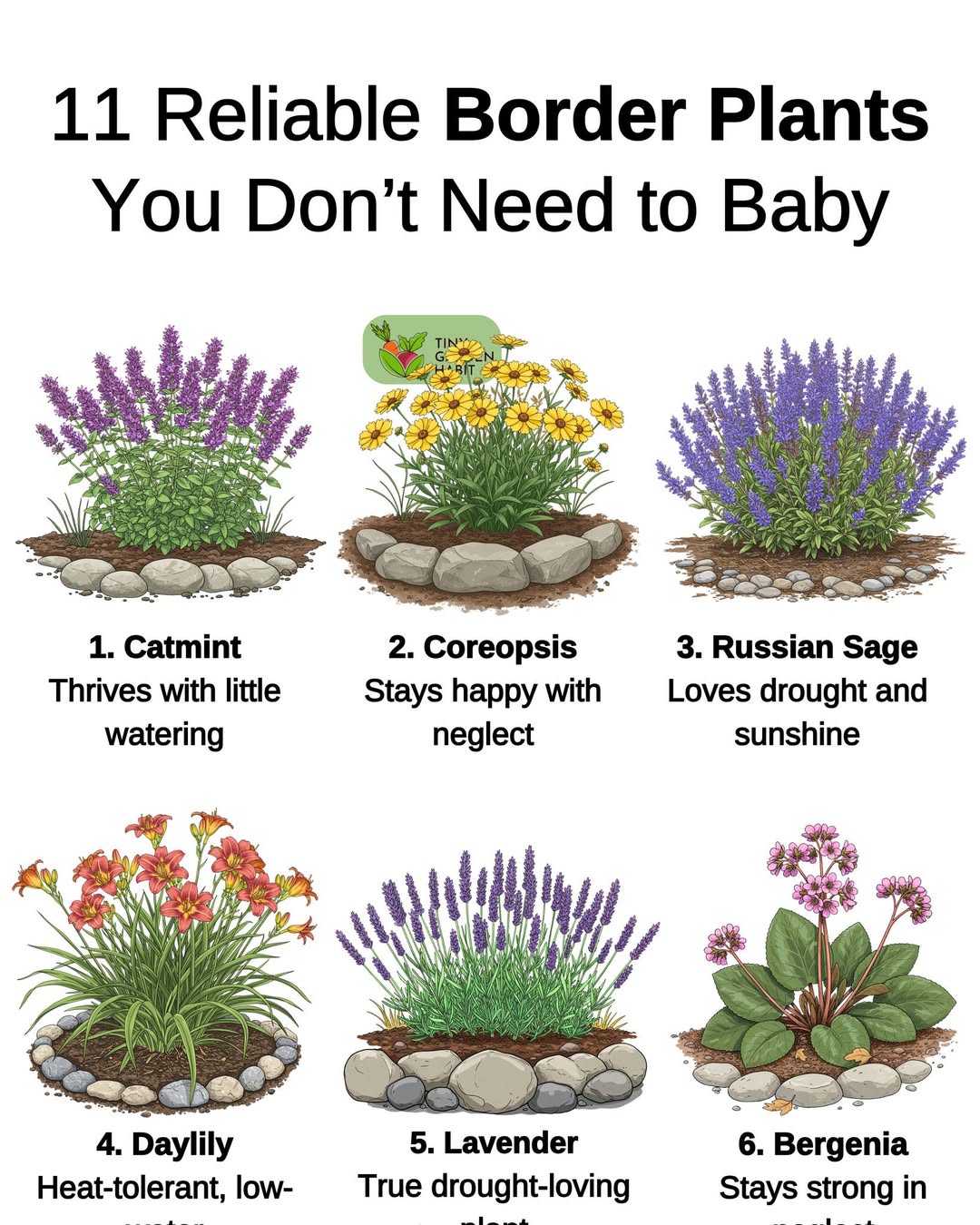 They return every year or reseed without becoming invasive. Invasive plants are the biggest no-no for garden borders, since their invasive nature means they’ll spread aggressively and not stay in one place…which is what borders aim to achieve.